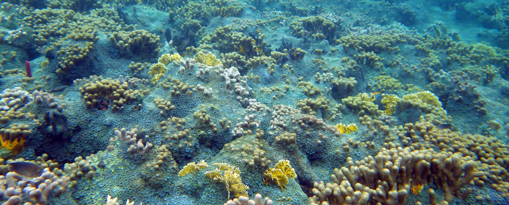 In the shallows, the reef was a patchwork of finger coral (Porites) and fire coral (Millepora alcicornis), intermingled with bright turquiose zoanthids (Zoanthus pulchellus), and sponges.